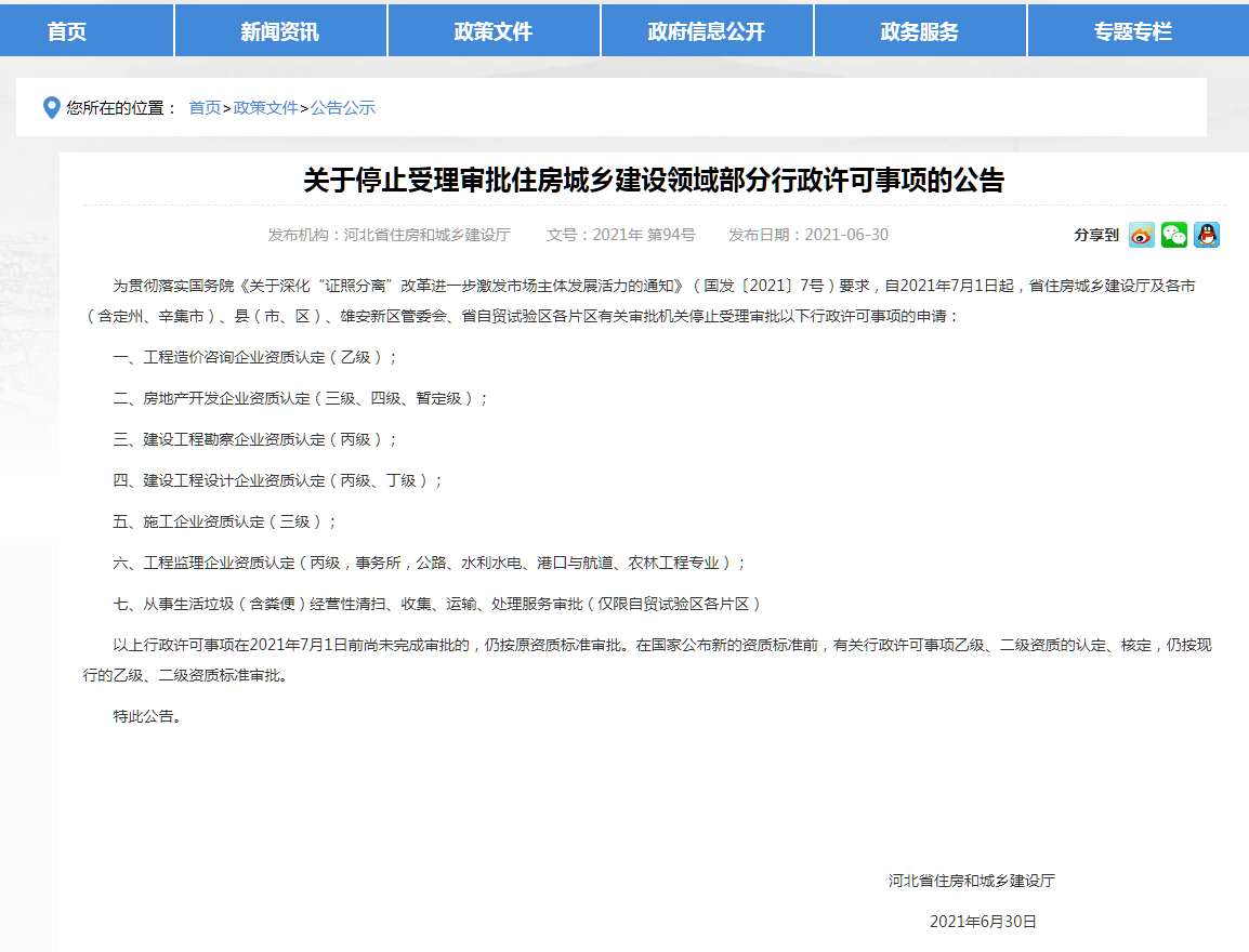 為貫徹落實國務(wù)院《關(guān)于深化“證照分離”改革進(jìn)一步激發(fā)市場主體發(fā)展活力的通知》(國發(fā)〔2021〕7號)要求,自2021年7月1日起,省住房城鄉(xiāng)建設(shè)廳及各市(含定州、辛集市)、縣(市、區(qū))、雄安新區(qū)管委會、省自貿(mào)試驗區(qū)各片區(qū)有關(guān)審批機(jī)關(guān)停止受理審批以下行政許可事項的申請: