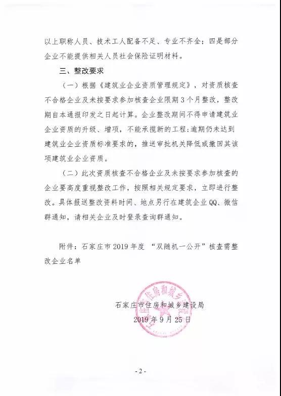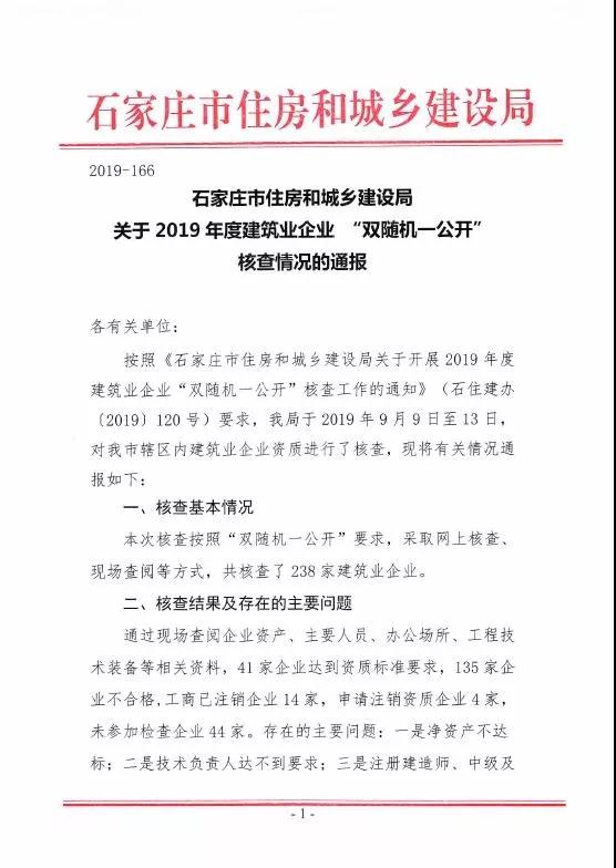 近日,河北石家莊市住建局通報2019年度建筑業企業