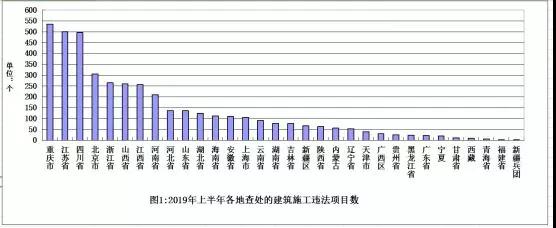 從各地查處的違法工程項目數(shù)量看,重慶、江蘇、四川3省(市)查處力度較大,分別查處項目535個、500個、496個(見圖1)。
