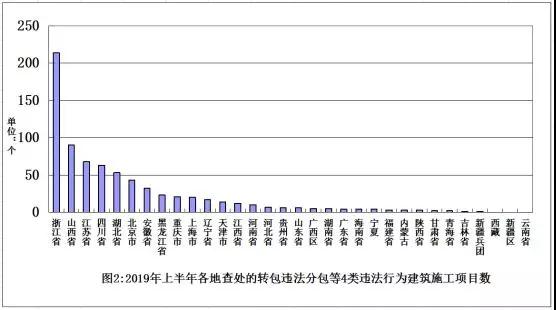 從查處的轉(zhuǎn)包、違法分包等4類違法行為看,浙江、山西、江蘇3省查處項目相對較多(見圖2)。