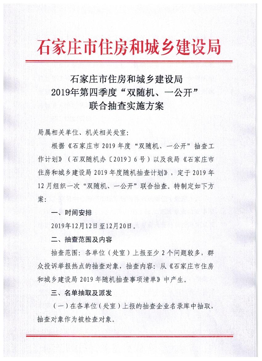 局屬相關(guān)單位、機(jī)關(guān)相關(guān)處室:根據(jù)《石家莊市2019年度“雙隨機(jī)、一公開”抽查工作計劃》(石雙隨機(jī)辦〔2019]6號)以及我局《石家莊市住房和城鄉(xiāng)建設(shè)局2019年度隨機(jī)抽查計劃》,定于2019年12月組織一次“雙隨機(jī)、一公開”聯(lián)合抽查。特制定如下方案。
