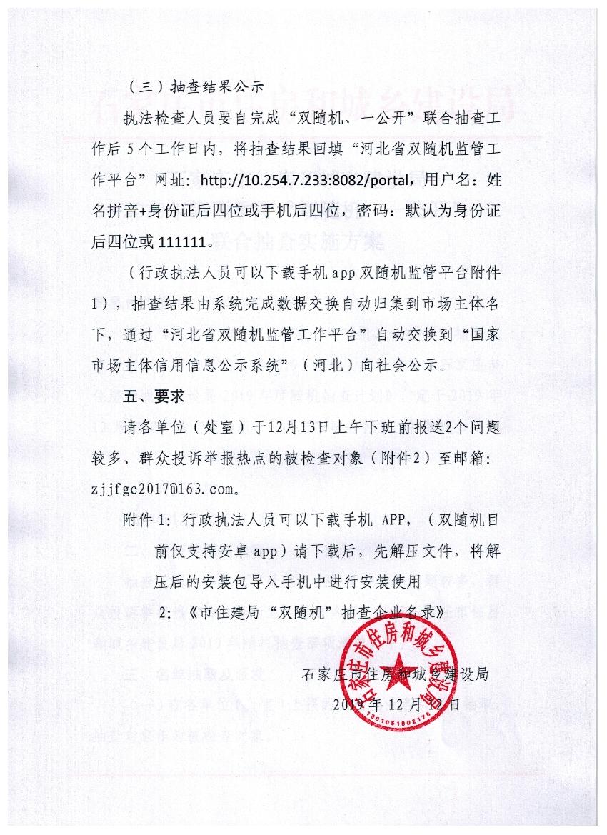 抽查范圍:各單位(處室)上報至少2個問題較多,群眾投訴舉報熱點的抽查對象,抽查內(nèi)容:從《石家莊市住房和城鄉(xiāng)建設(shè)局2019年隨機(jī)抽查事項清單》中產(chǎn)生。